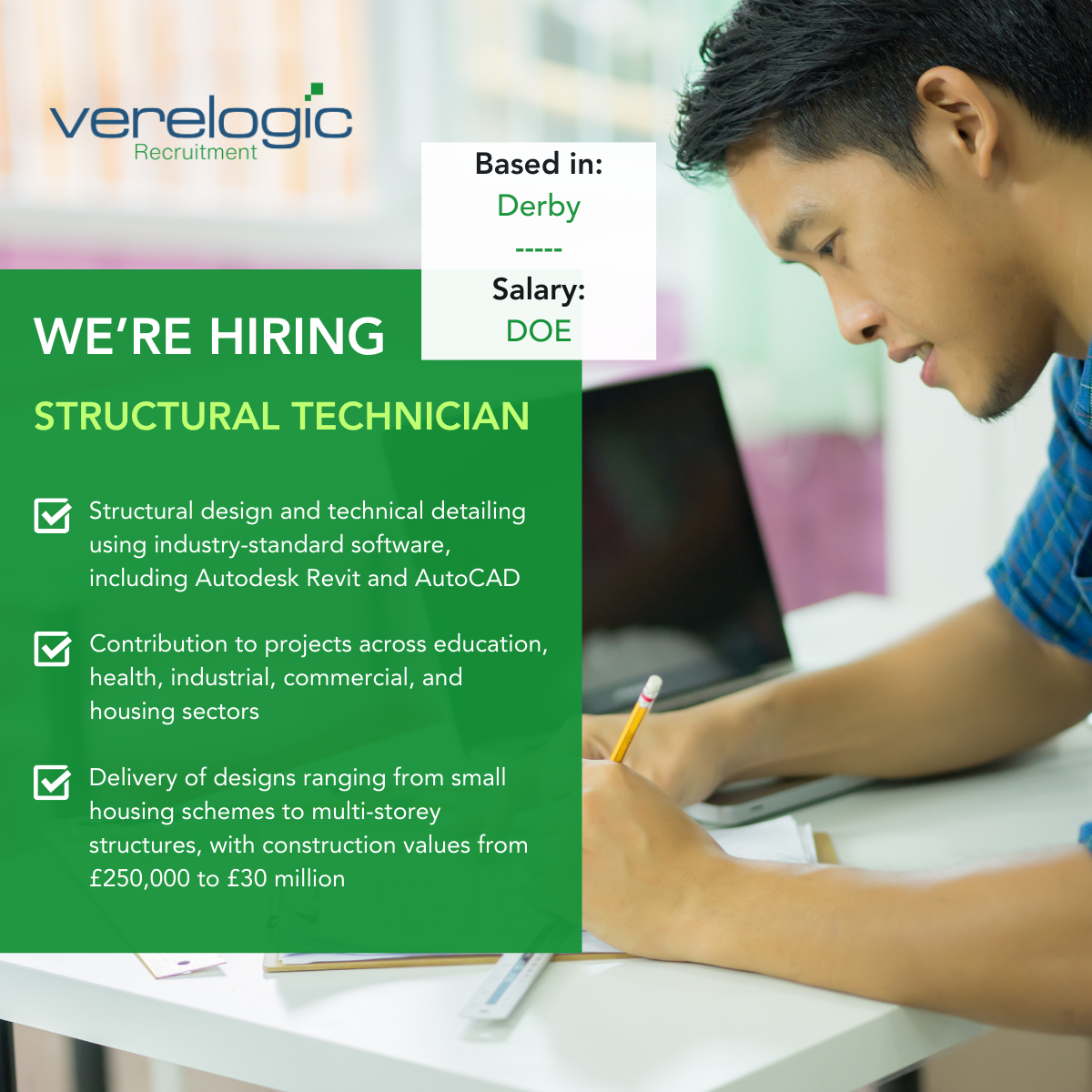 Structural Technician Location: Derby Salary: Competitive Overview Our client is an established multidisciplinary engineering consultancy who has an immediate requirement for a Structural Technician to join its structural engineering design team based in Derby. The role offers exposure to a wide range of projects across multiple sectors and supports ongoing professional development. Key Responsibilities Structural design and technical detailing using industry-standard software, including Autodesk Revit and AutoCAD Contribution to projects across education, health, industrial, commercial, and housing sectors Involvement in designs ranging from small housing schemes to multi-storey developments, with construction values between £250,000 and £30 million Support on projects delivered to BIM Level 2 Structural design using steel, timber, masonry, and reinforced concrete Application of geotechnical engineering principles within structural designs Supporting less experienced team members where required Skills & Experience Essential: Minimum 3 years' experience in a Structural Technician role or similar Working knowledge of AutoCAD Knowledge of Revit Strong analytical skills OND level qualification in a related discipline or higher Sound knowledge of geotechnical engineering Desirable: Strong teamwork ethic Self-motivated approach Strong focus on client care Education & Professional Development Qualified to OND level or higher in a relevant discipline Assistance available toward membership of relevant professional institutions if required Proven support and mentoring towards ICE or IStructE membership Training opportunities available to support progression to HNC and degree-level qualifications Personal Attributes Strong analytical and problem-solving ability Able to work effectively both independently and as part of a team Confident communicator, both verbally and in written English Client-focused, with strong interpersonal skills